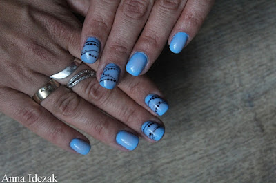Przygotowałam płytkę za pomocą frezarki, pilnika i bloczku polerskiego. Odtłuściłam paznokcie cleaner'em i nałożyłam primer. Następnie za pomocą bazy nadbudowałam. Najpierw cienka warstwa na cały paznokieć, a później większą kulkę rozkładam tak, aby nadbudować paznokcie. Utwardzam w lampie. Nałożyłam dwie warstwy jasnoniebieskiego koloru, który jest przepiękny. Każdą utwardzając w lampie. Następnie tą samą bazę nakładam na środek paznokcia i rozkładam tak, aby z każdej strony paznokcia kolor był bardziej intensywny, a im bliżej środka - mleczny. Pomaga siła grawitacji więc możemy odwrócić rękę przez co baza ładniej się rozłoży. Robimy taki gradient lub ombre w manicure. Utwardzam. Żeby nie było zbyt nudno na 2 paznokcie każdej ręki nałożyłam spider gel czarny robiąc kilka cienkich linii. Sondą robię czarne kropki. Utwardzam. Całość pokrywam błyszczącym topem i utwardzam. Oliwka na skórki i mleczne ombre gotowe :)